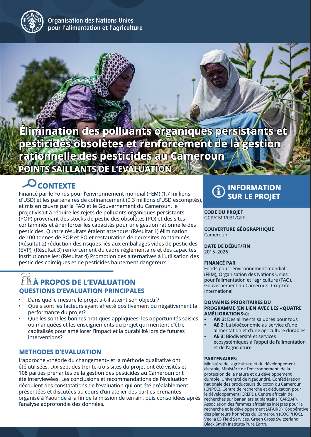 For example, the final report of a project evaluation on Disposal of persistent organic pollutants and obsolete pesticides and strengthening sound pesticide management in Cameroon is an 118-page document. Our team created a two-page highlight document summarising the key findings in a more digestible way.