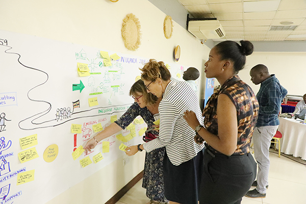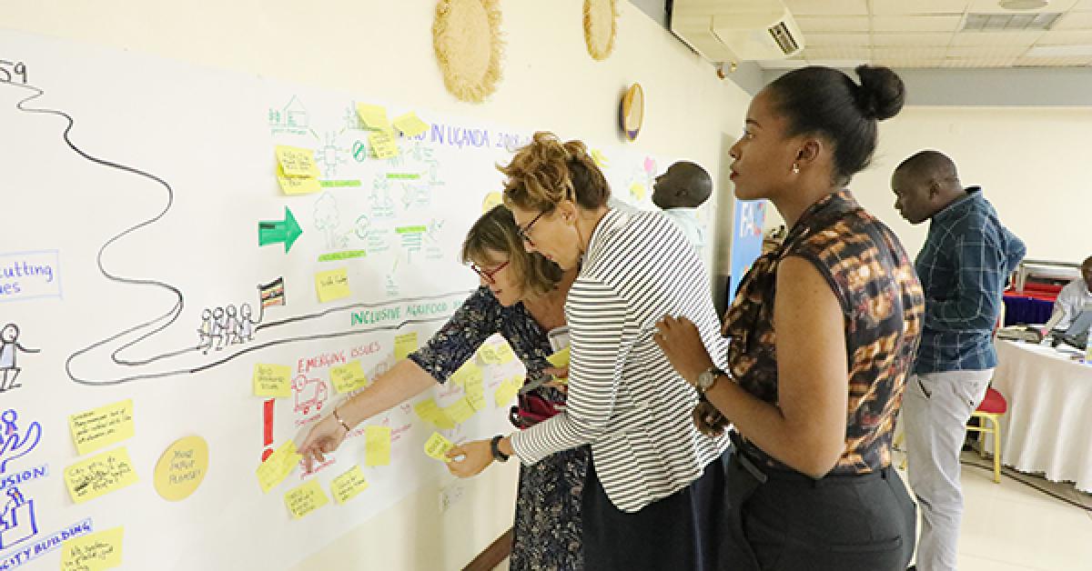 In the Uganda Country Programme Evaluation, we piloted the use of graphic facilitation in stakeholder workshops. This involved creating a visual representation of the preliminary findings to give a holistic overview and encourage engagement. Through their participation, stakeholders were able to shape the evaluation process, as the gaps they identified in our image were used to guide the final stage of the evaluation.