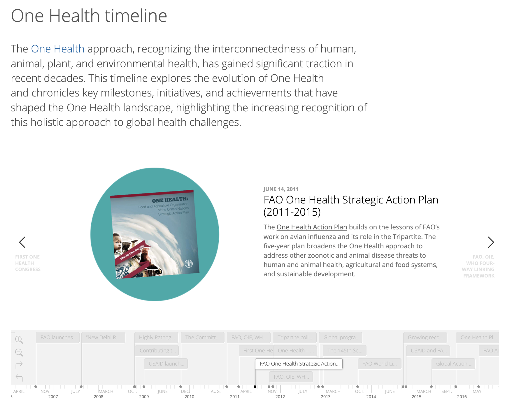 The recent evaluation of FAO’s support to One Health uncovered a wealth of historical insights - an invaluable resource for institutional learning. Recognizing that this information could serve a much broader purpose beyond the evaluation itself, OED partnered with the One Health division to develop an interactive timeline https://www.fao.org/one-health/highlights/one-health-timeline/en. The result was a dynamic visual designed to support knowledge and learning from FAO colleagues and partners. The collaboration was not just about validating content—it was about jointly shaping how the information would be communicated and used.