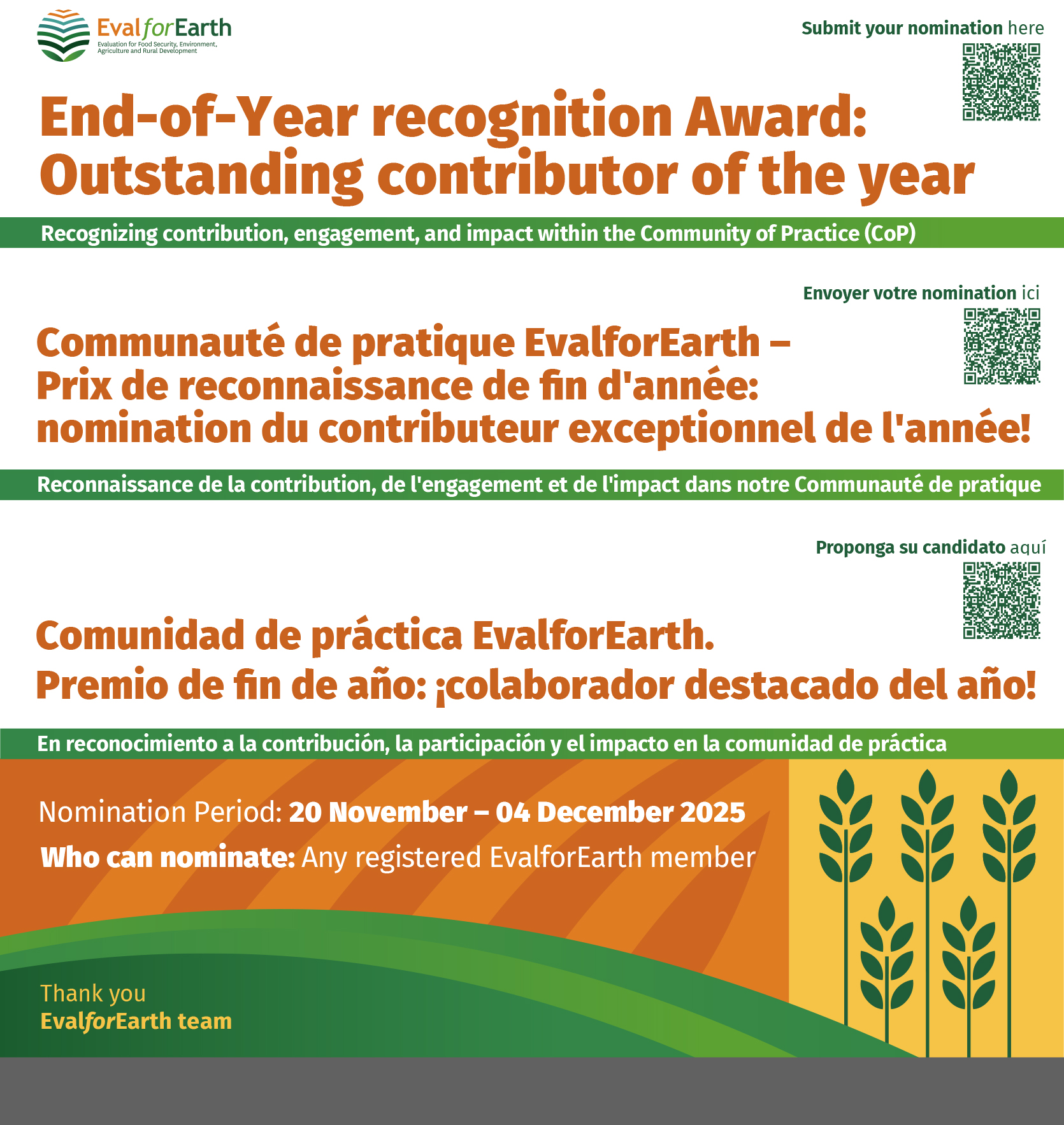 It’s time to celebrate a member who has made a difference in 2025! The EvalforEarth Community of Practice (CoP) End-of-Year Recognition Award honors an individual who has shown commitment, learning, collaboration, and leadership in advancing evaluation for Food Security, Environment, Agriculture, and Rural Development.