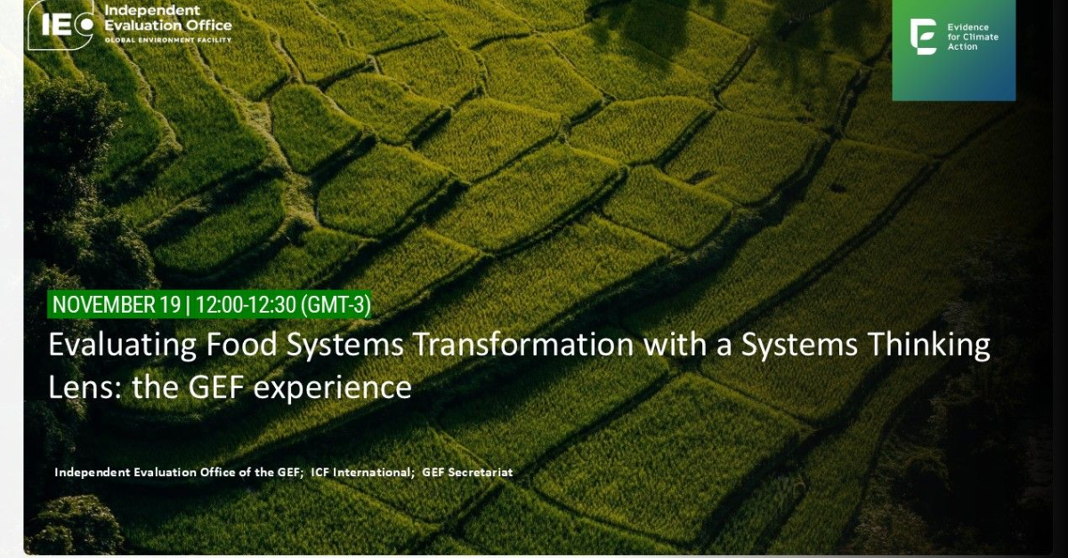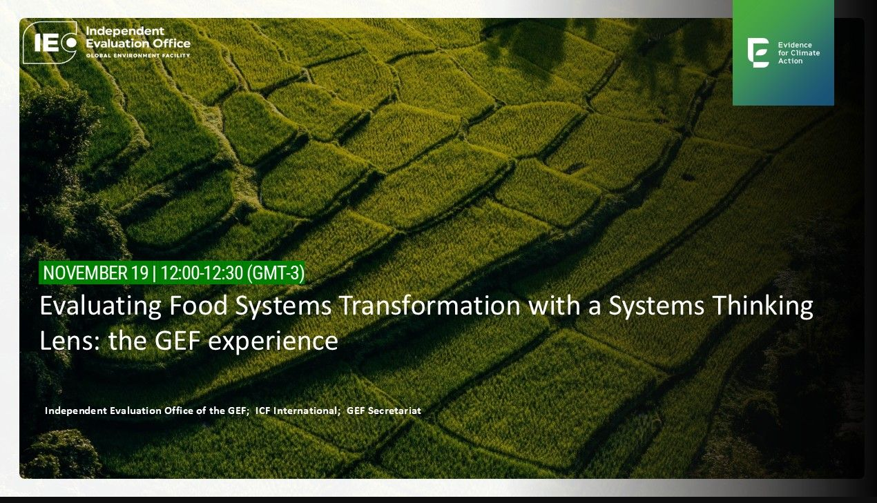November 21 2025 webinar Evaluating Food Systems Transformation with a Systems Thinking Lens: the GEF Experience HybridEvaluating Food Systems Transformation with a Systems Thinking Lens: the GEF ExperienceRegister here Agriculture Evaluation methods Evaluation process Food Security Monitoring & Evaluation