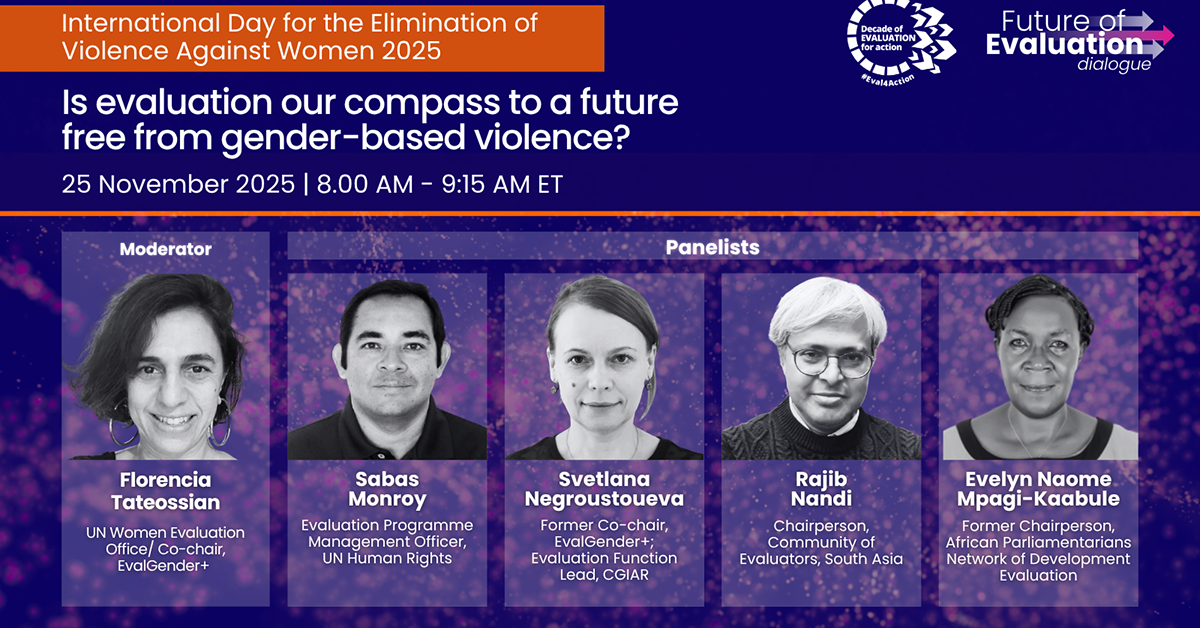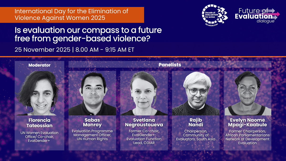 In observance of the International Day for the Elimination of Violence Against Women, the fourth Future of Evaluation dialogue on November 25, 2025, will explore the pivotal role of evaluation in guiding efforts towards a future free from gender-based violence (GBV). The discussion will focus on how gender-responsive evaluation and inclusive evaluation methodologies can drive effective interventions and ensure accountability to end GBV in all its forms, including the growing challenge of technology-facilitated GBV. The dialogue will also explore how to best leverage evaluation results to directly influence and achieve GBV policy reforms.