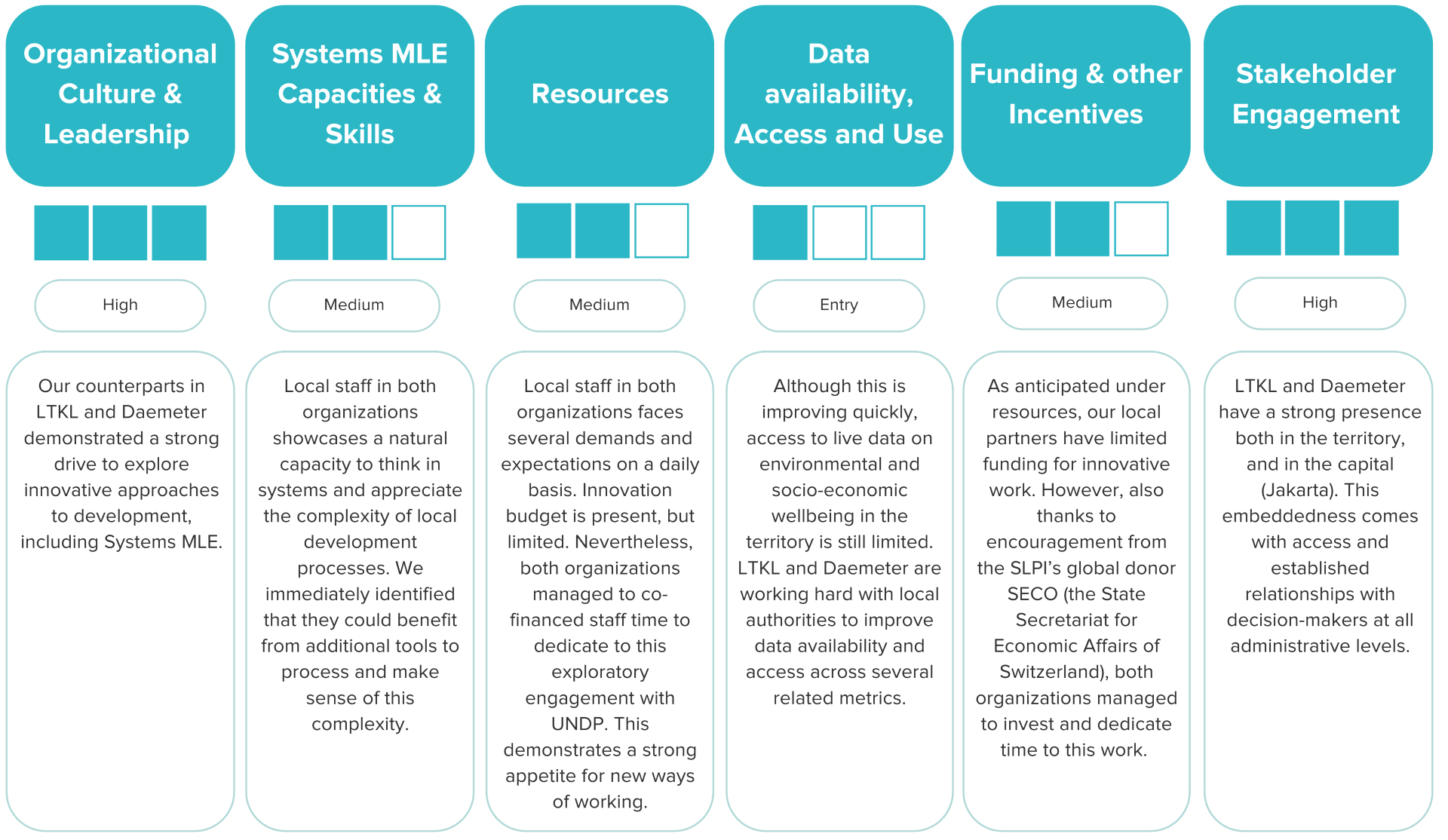 Avons d'approfondir ces points, la figure 2 fournit une vue d'ensemble de l'évaluation diagnostique des conditions favorables pour le SEA des systèmes menée pour LTKL et Daemeter. L'évaluation a permis à l'équipe du projet «Systems MLE» d'adapter les approches et les pratiques recommandées au contexte du partenaire.