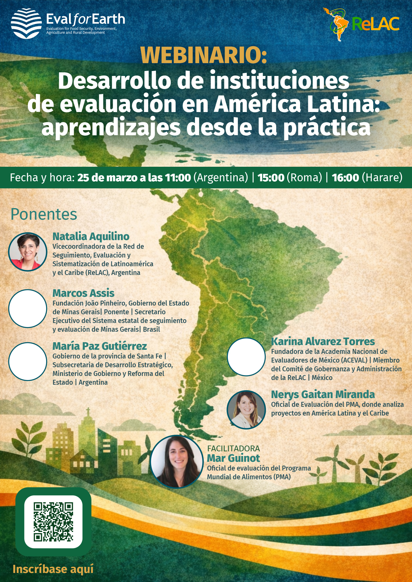 Este webinar invita a explorar cómo se están construyendo y fortaleciendo las instituciones de evaluación en América Latina. A partir de experiencias recientes de los sistemas nacionales y subnacionales de evaluación en Argentina, Brasil y México, las y los panelistas compartirán aprendizajes sobre oportunidades y barreras para institucionalizar la evaluación y que esta influya en la toma de decisiones. La sesión mostrará rutas concretas para potenciar el papel de las instituciones de evaluación en el avance de los objetivos de desarrollo sostenible en la region. La facilitadora : Mar Guinot, Oficial de evaluación del Programa Mundial de Alimentos (PMA), donde lidera Evaluaciones de Planes Estratégicos de País y brinda apoyo técnico, asesoría y orientación en toda la función de evaluación descentralizada. Cuenta con más de una década de experiencia en evaluación tanto en el PMA como en el PNUD.